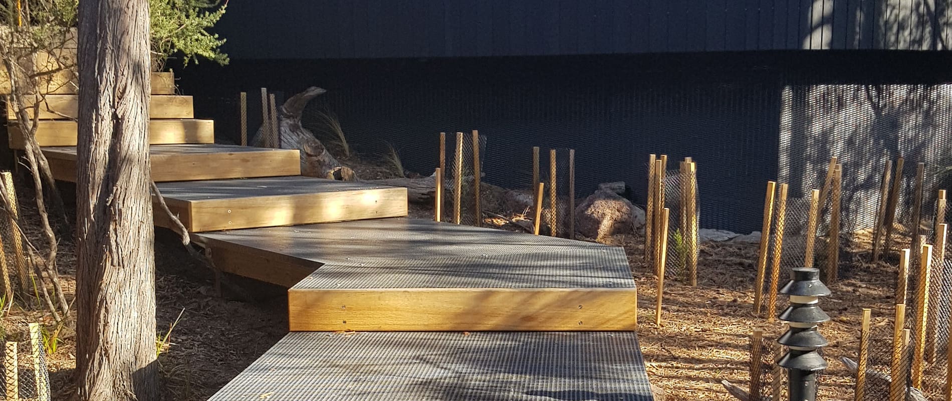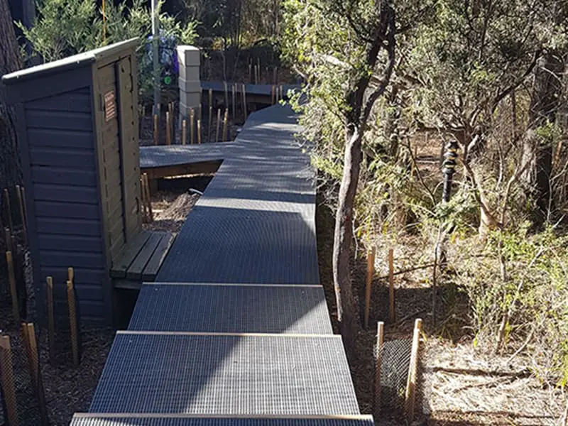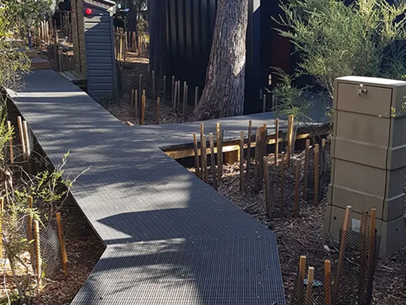 To protect the delicate environment, the cabins and pavilions are linked by raised boardwalks. Treadwell was engaged to supply the grating for these boardwalks.