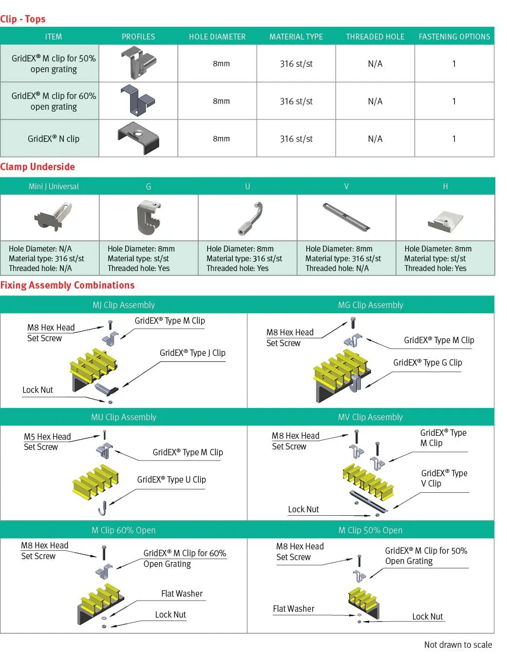 Treadwell stocks a range of durable 316 stainless steel secure clip options for GridEX® pultruded FRP grating. Further details regarding fixing types and ordering information can be found in the EX-Series® Grating Product Guide.