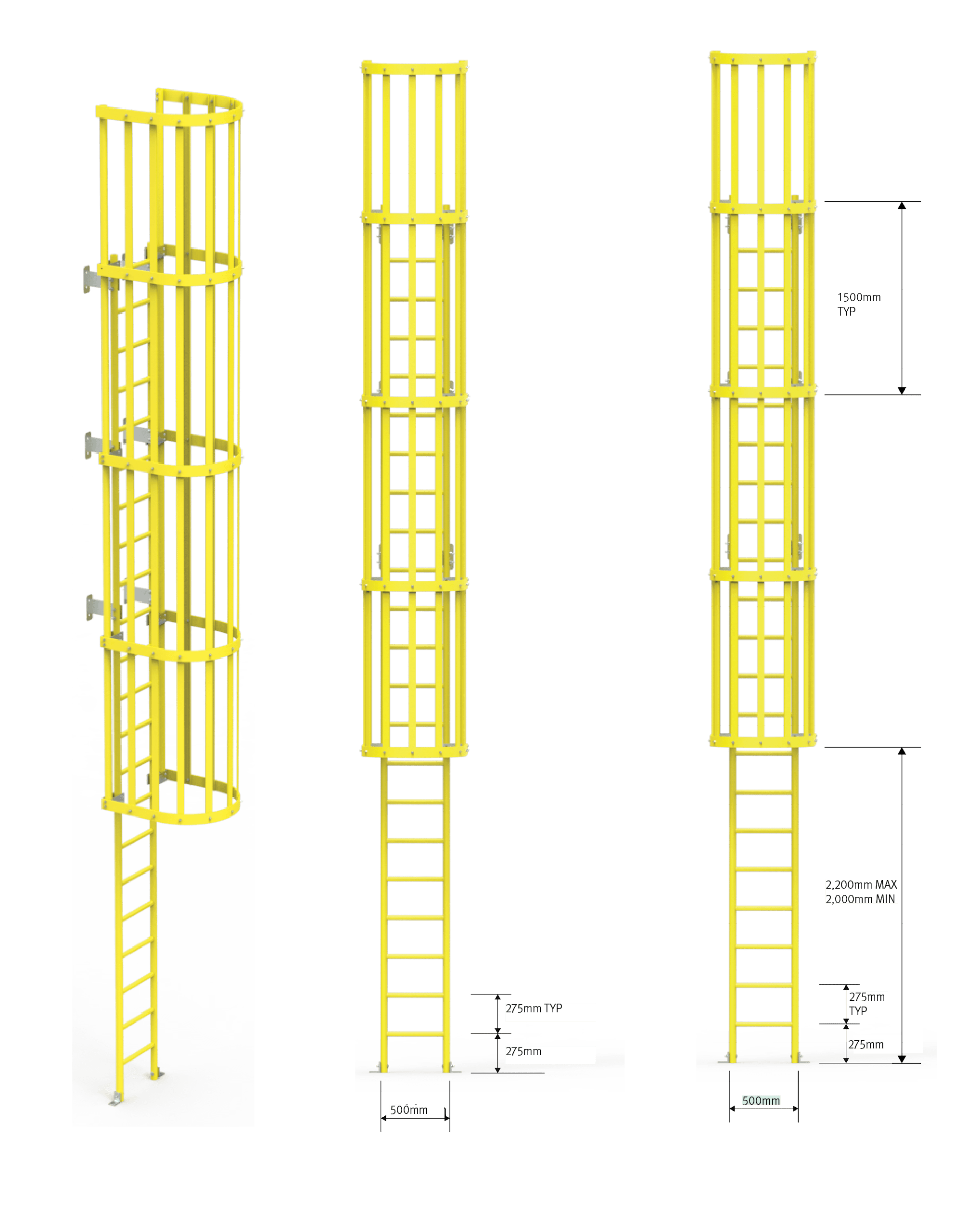 The side rails, rungs and cage straps are manufactured from pultruded fibreglass reinforced components which can be found in Treadwell’s RailEX® componentry. The side rails are either 50mm round or square tube with a wall thickness of 4mm or greater. The rungs shall be pultruded 32mm across the FRP fluted tube.