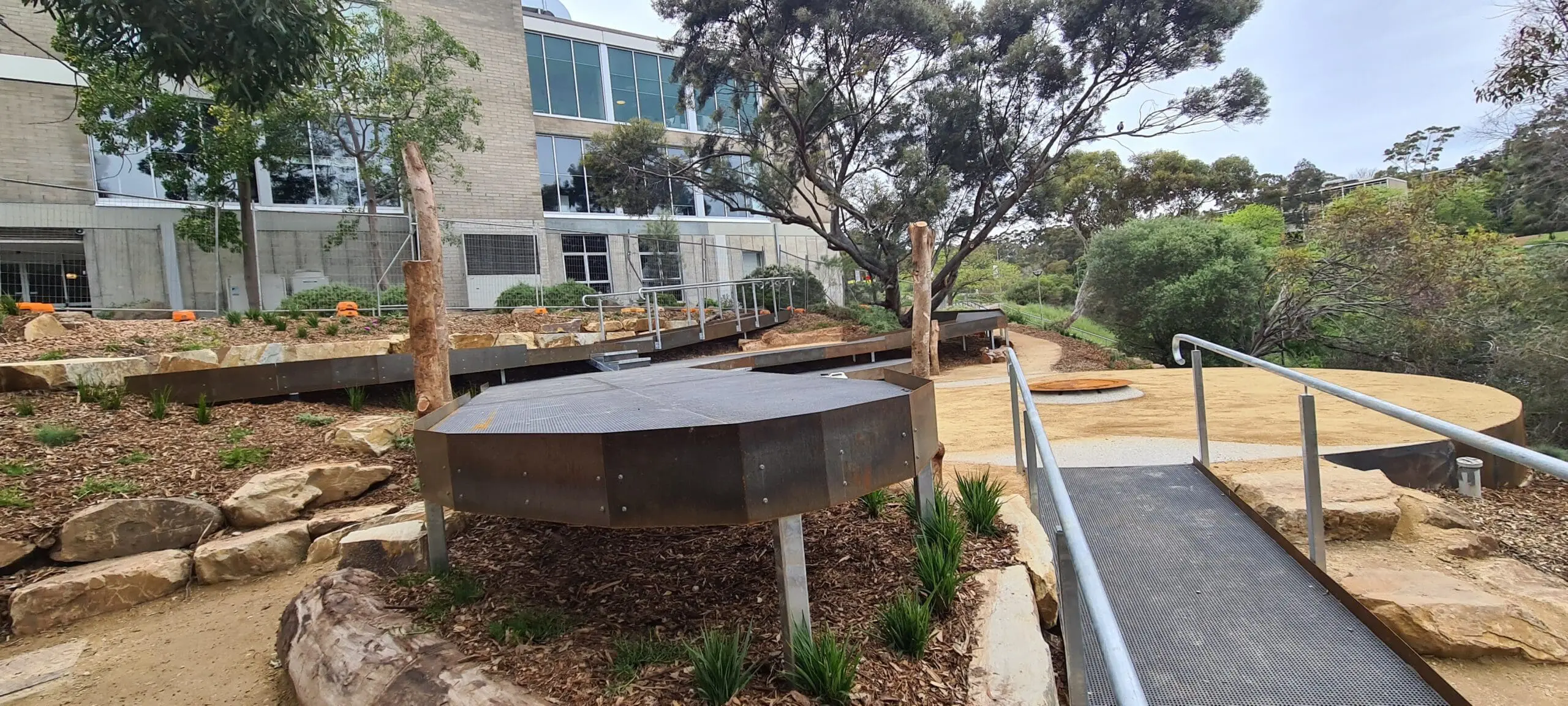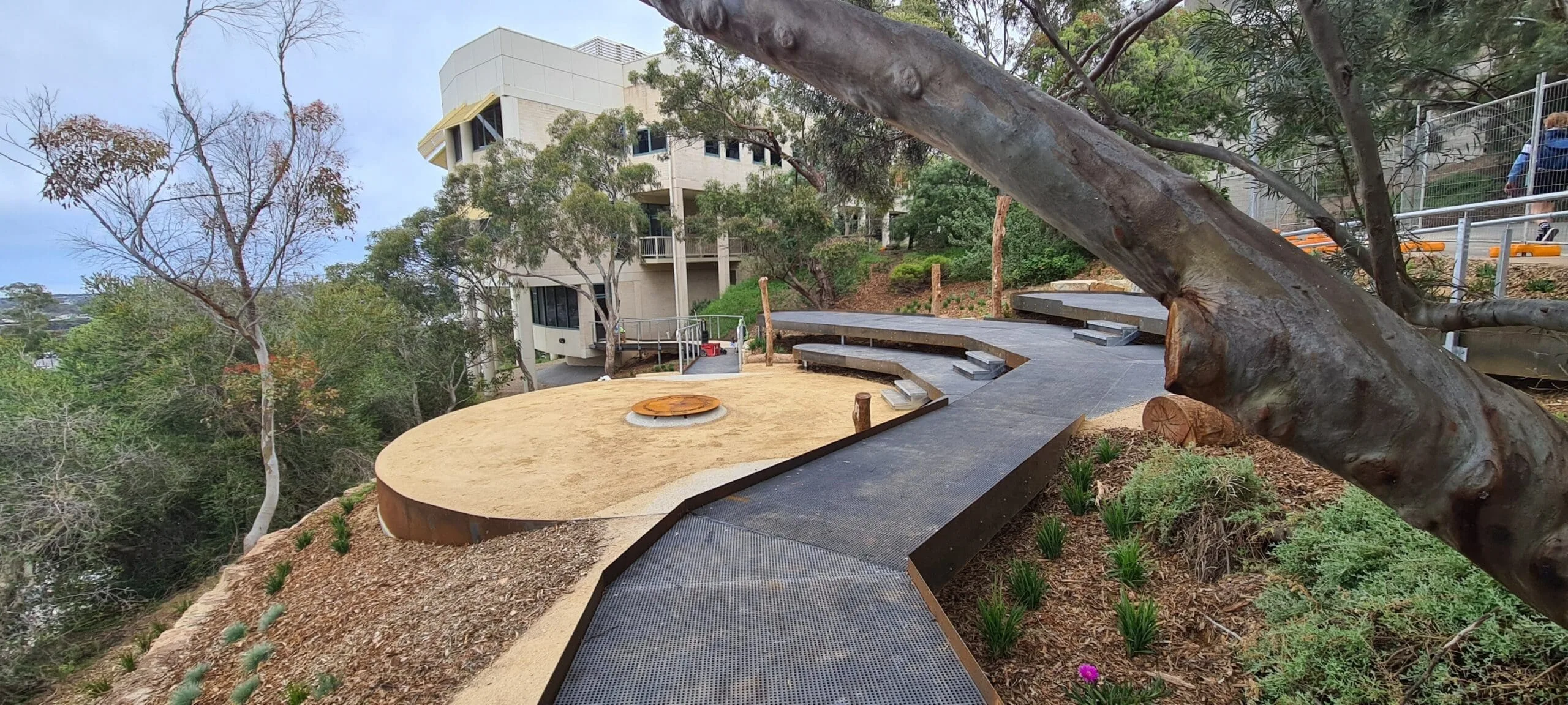 Yunggorendi Cultural Gathering Space Flinders University, South Australia – Built on the principles of minimal disturbance and celebrating landscape, these decks provide access for people of all abilities. Drawing inspiration from fallen gum trees, the decks form overlapping structures that surround a central amphitheatre space, facilitating a broad range of uses; from private study nooks to large capacity events.
